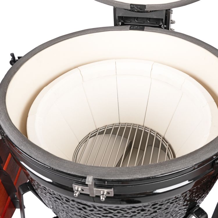 Az új nyitószerkezettel szinte súlytalanná válik a masszív kerámia dóm és biztonságosan megtartja azt miközben a húsokat forgatjuk a rácson.