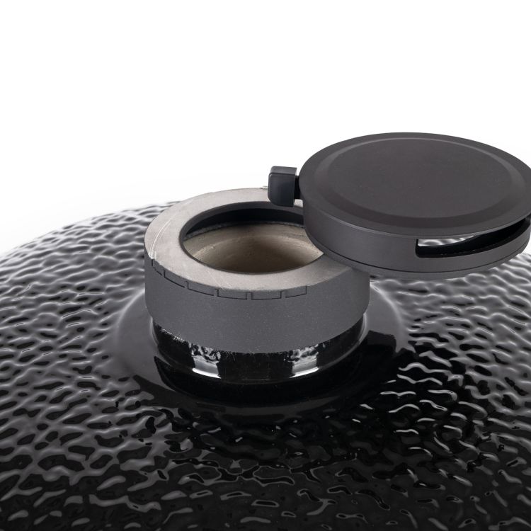 A zár billenő gombján lévő hőszigetelés gondoskodik arról, hogy akár grillkesztyű nélkül is egyetlen mozdulattal nyithassük a kamadónk tetejét.